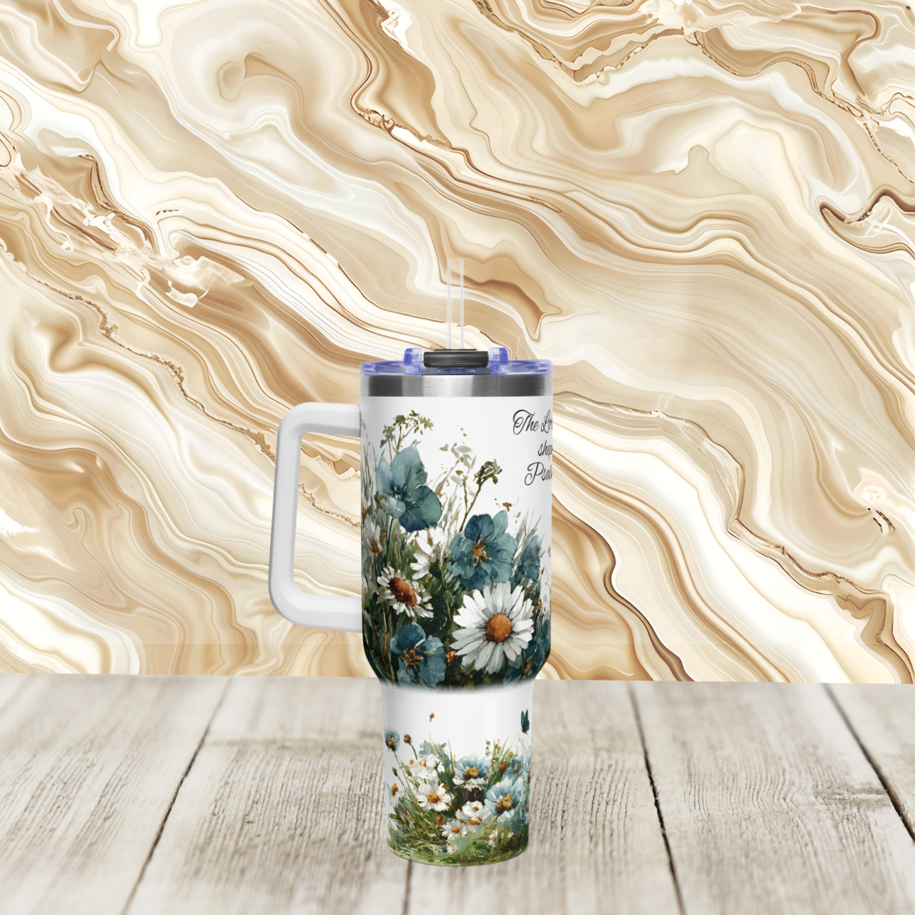 This 40oz vacuum thermal tumbler brings a quiet pause into busy days. A soft meadow of daisies and teal blossoms wraps around the gentle script of Psalm 23:1, offering a small, steady reminder of faith during long drives, church events, or slow mornings on the porch. The tall, rounded silhouette and comfortable handle make it easy to hold whether you’re juggling a steering wheel or a Bible study notebook. Vacuum insulation preserves the warmth of your coffee or the chill of iced tea for hours, while a removable resealable lid reduces spills on the move. The unprinted stainless-steel rim adds a subtle, durable edge that will age gracefully with everyday use.