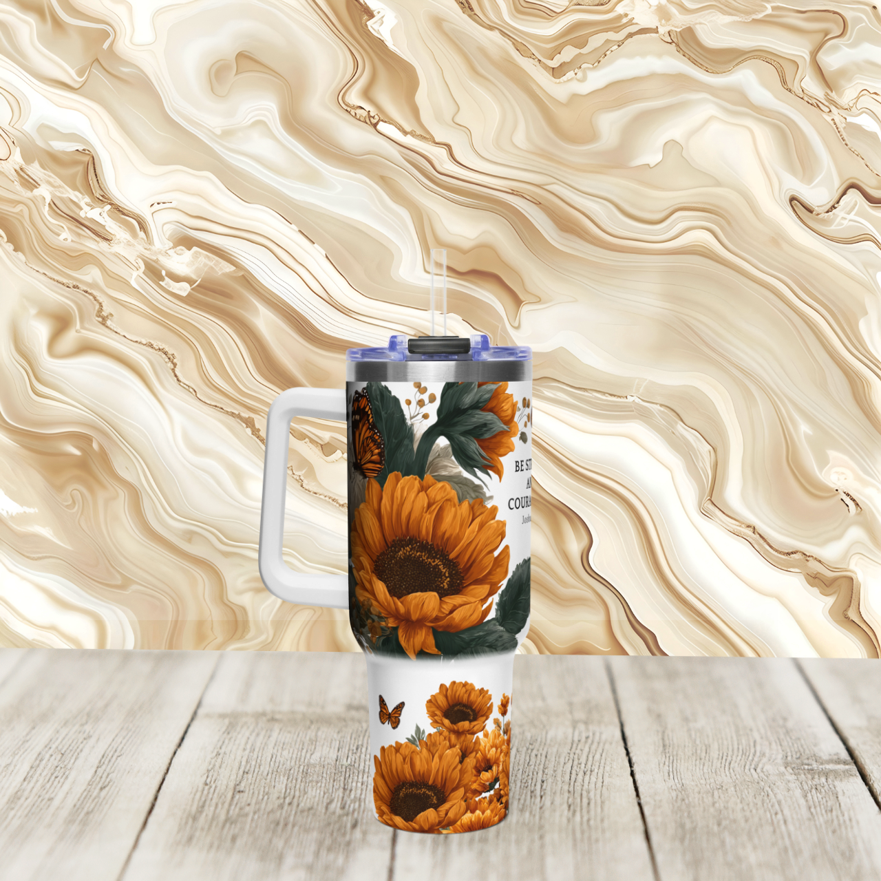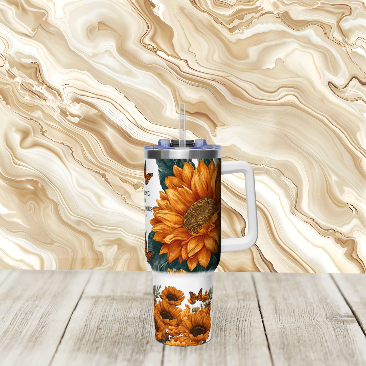 This 40oz vacuum tumbler brings a little sunlit courage to wherever your day takes you. Wrapped in warm sunflower art and delicate butterflies, the stainless steel cup carries Joshua 1:9—Be Strong and Courageous—as a quiet, steady nudge during busy commutes, long study sessions, or reflective porch mornings. The tall, slim silhouette slips into most cup holders and the sturdy handle makes it easy to grab on the go. Vacuum insulation locks in temperatures for hours, so coffee stays comforting on cold mornings and iced drinks stay cold through afternoon chores. The resealable lid with straw keeps spills away, while the unprinted stainless rim and rounded edges give a clean, durable finish that stands up to daily life. This tumbler feels like a small, faithful companion — a practical, hopeful presence for anyone who wants a bit of floral light and scripture with their hydration.