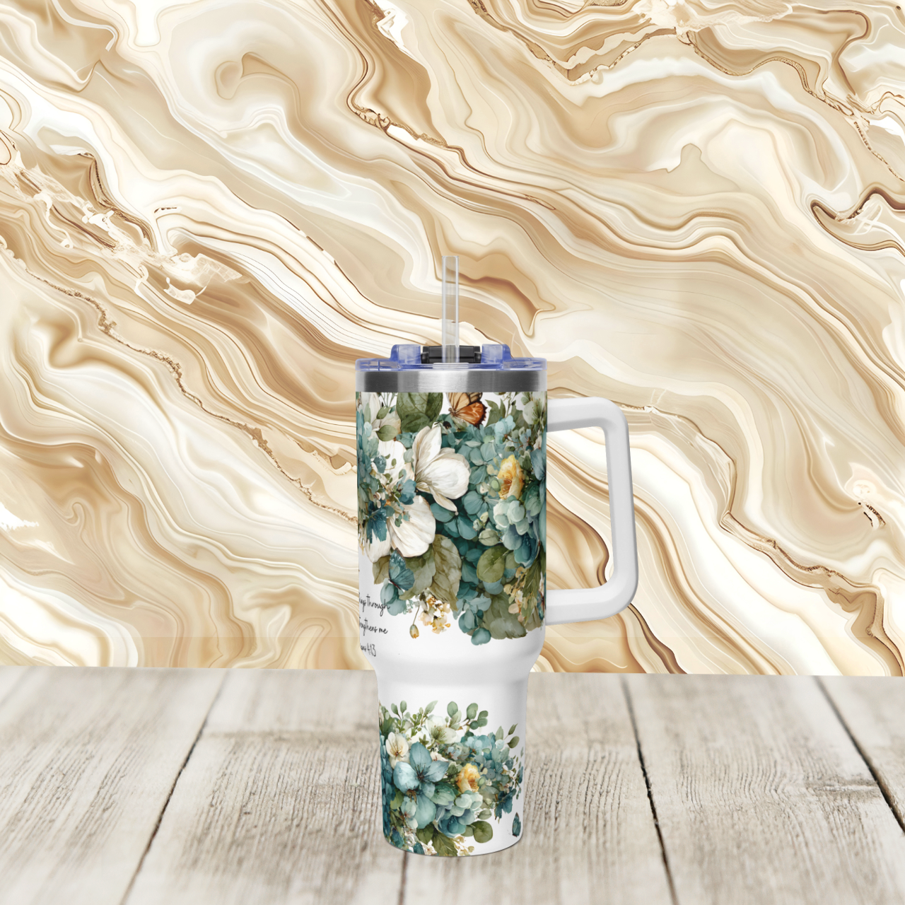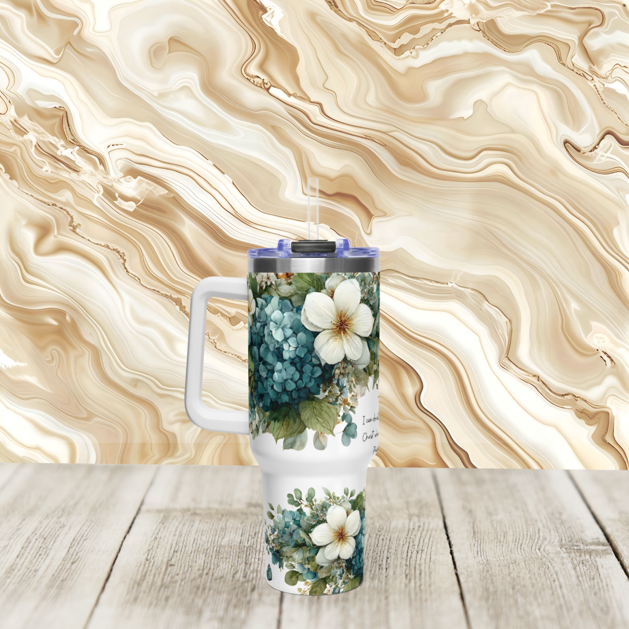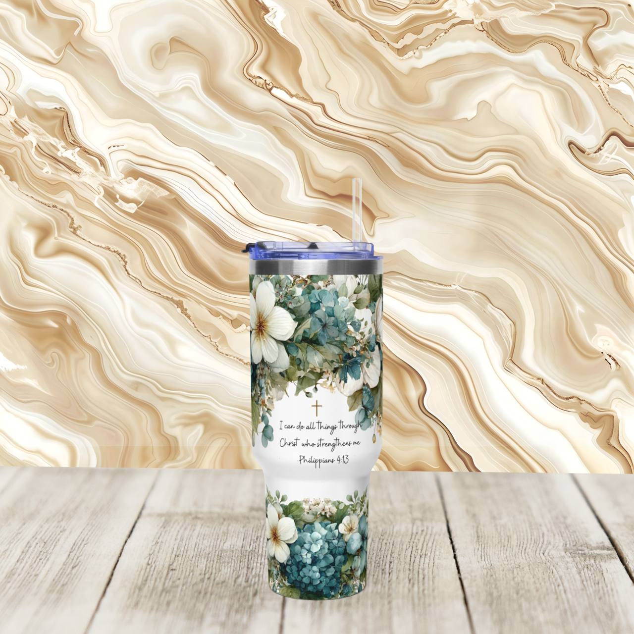 Phillipians 4:13 40oz Floral Scripture Tumbler — "I Can Do All Things" Vacuum Insulated Travel MugA roomy 40oz stainless steel tumbler wrapped in soft botanicals and a quiet verse, made to keep drinks exactly how you like them while you move through a busy day. The watercolor hydrangeas and white blooms create a calming, cottage‑garden feel that pairs with the small cross and handwritten scripture for a subtle, personal touch. The rounded silhouette and comfortable handle make it easy to hold on the go, and the removable, resealable lid with straw keeps sips spill‑resistant whether your drink is steaming or iced. The stainless rim remains unprinted, giving the piece a clean, polished edge that complements the design.