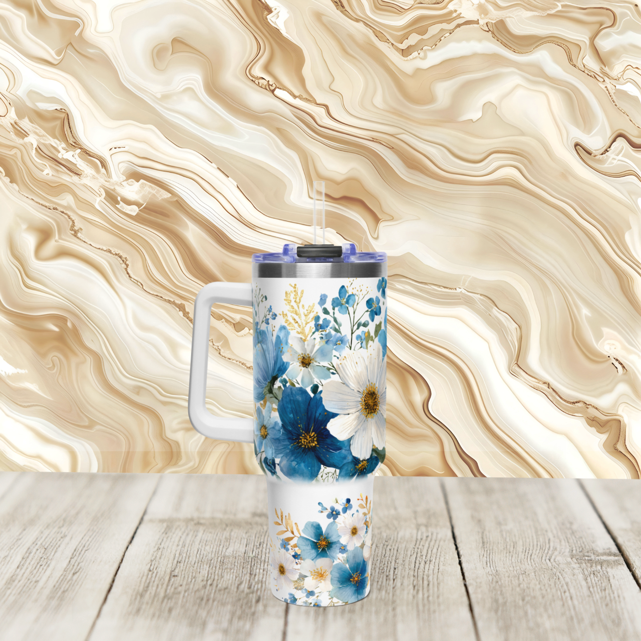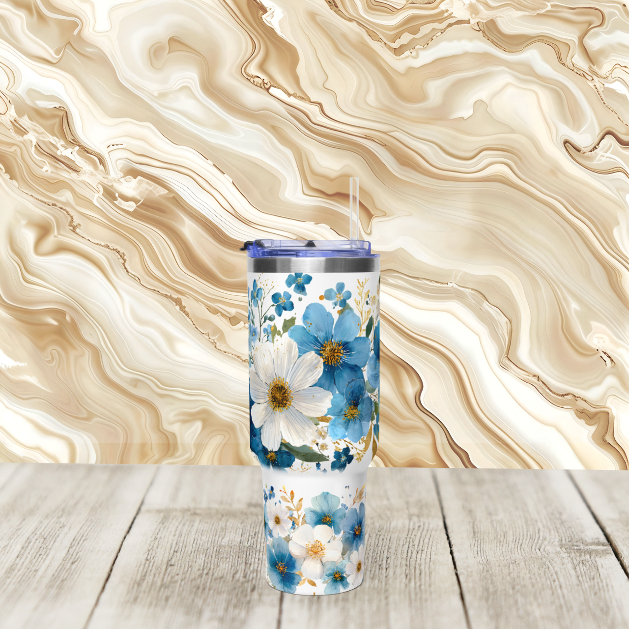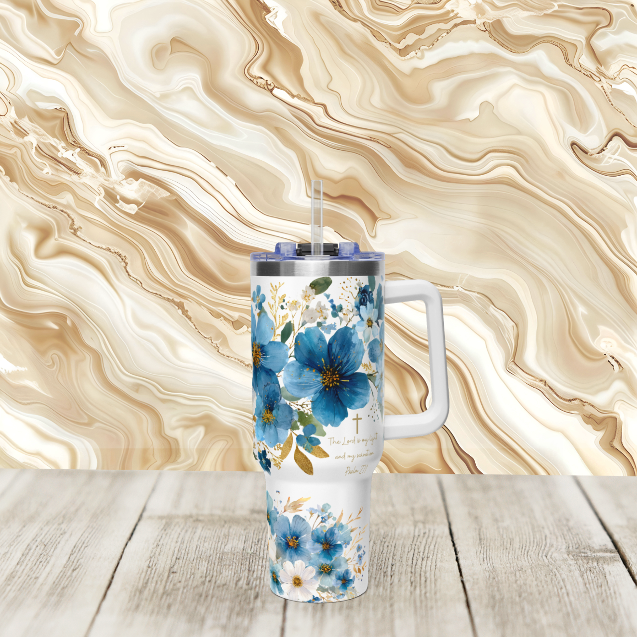 40oz Blue & White Wildflower Vacuum Tumbler — Psalm 27 Floral Travel Cup