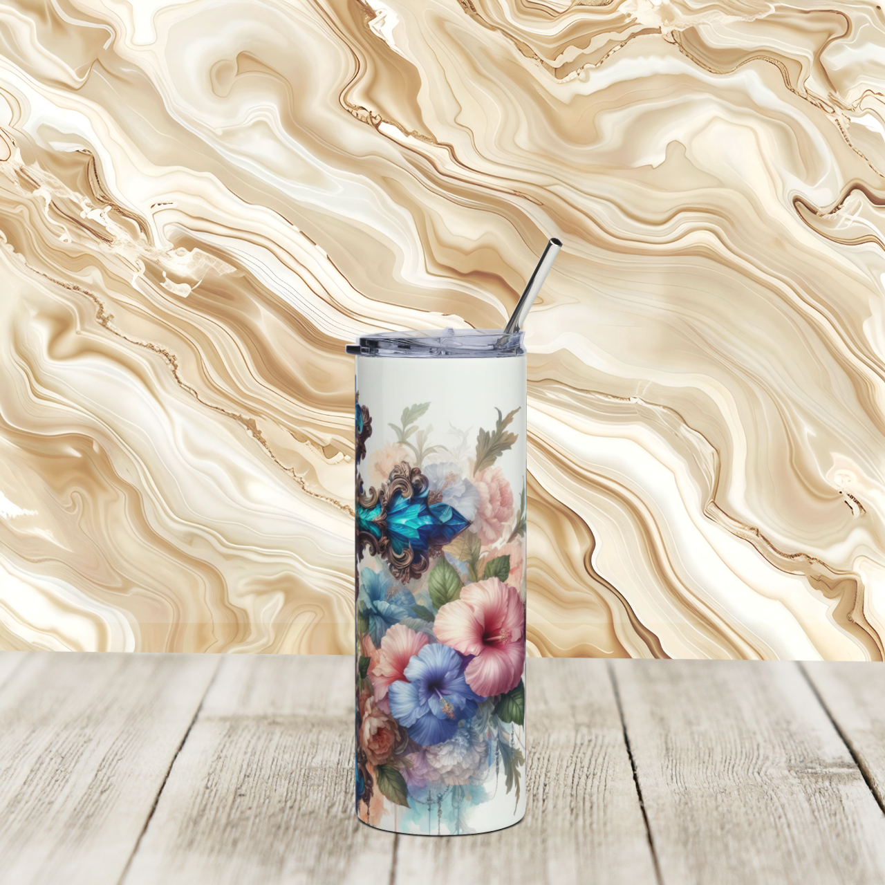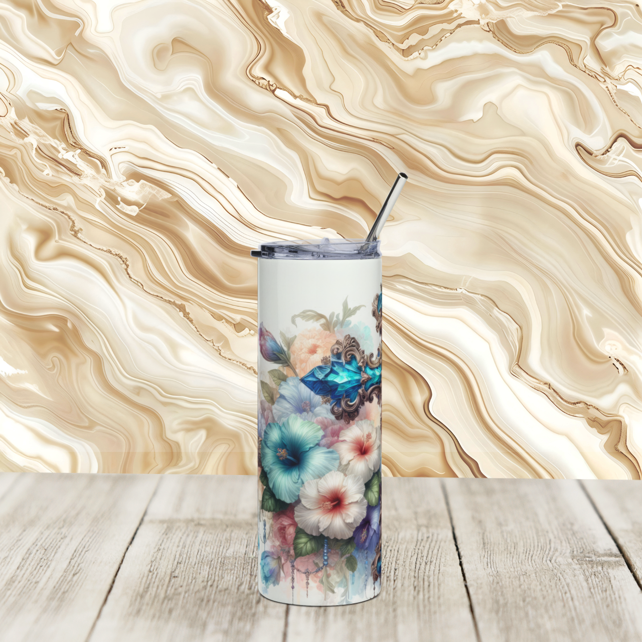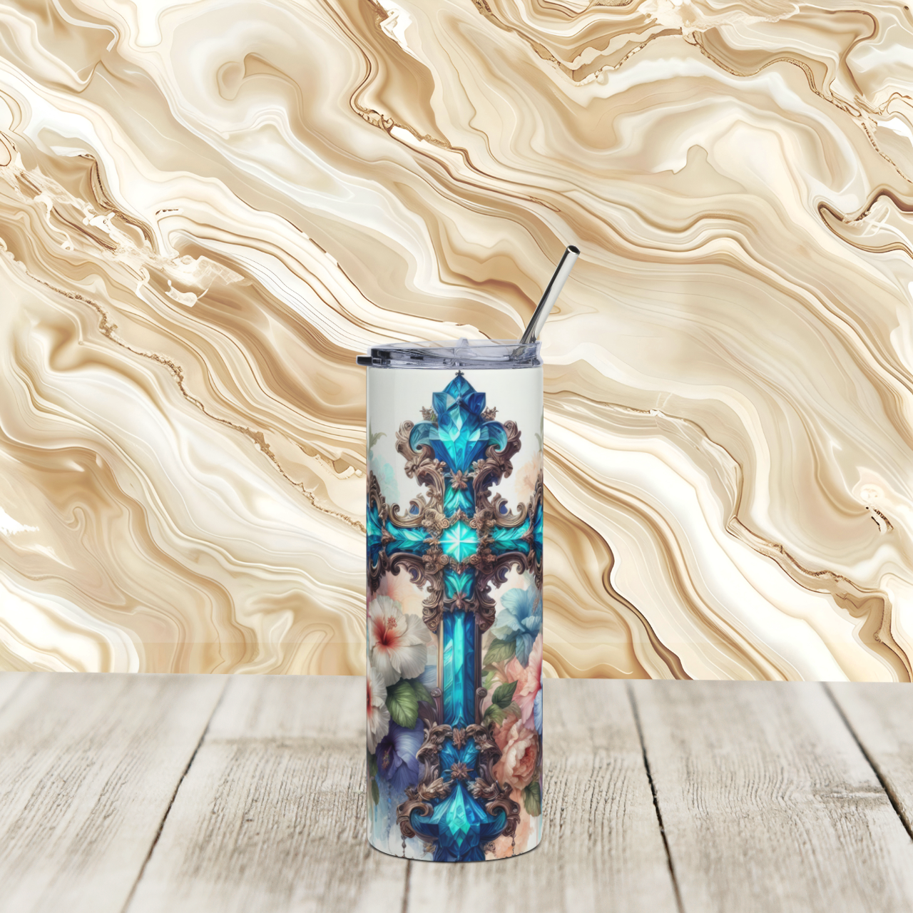 This 20 oz stainless steel tumbler blends quiet devotion with soft, floral artistry. The tall, slim silhouette feels steady in your hand while a turquoise, cathedral-style cross rests amid watercolor blooms — a small altar to carry with you. Double-wall insulation holds hot coffee warm on early drives and keeps iced tea chilled on sunlit porches. The glossy protective finish lets the intricate design glow from every angle, and the included clear lid and reusable straw make slow, reflective sips easy wherever you pause. It sits like a keepsake on a nightstand or in a car cup holder, bringing a gentle, reverent presence to morning routines, road trips, or moments of rest.