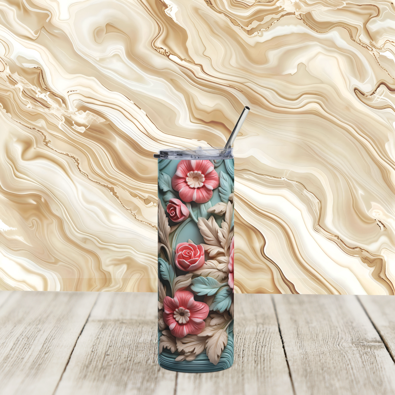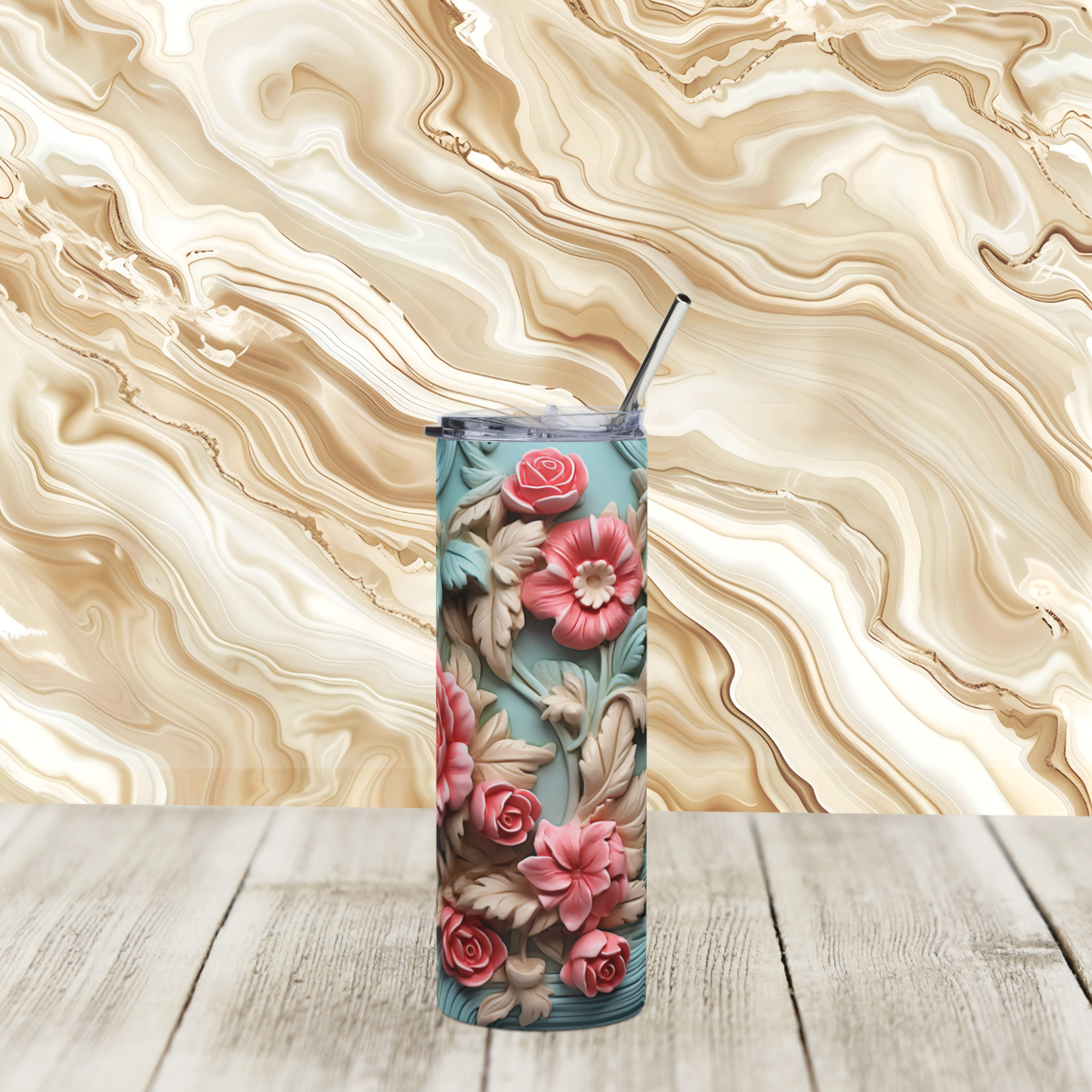 This 20 oz stainless steel tumbler wraps quiet garden moments into your everyday routine. Soft coral and teal roses flow around the slim cylinder like a tiny sculpted vase, so sipping morning coffee or afternoon iced tea feels intentionally beautiful. It has enough presence to rest on a windowsill or desk without taking over, and the glossy protective layer keeps the floral relief bright through daily use. The clear lid and reusable straw make on-the-go sipping tidy, while the sturdy stainless build holds up to commute jostles and repeated use. For anyone who notices small artful details and wants a calm, botanical pause between meetings, this tumbler brings a little cultivated stillness wherever it goes.