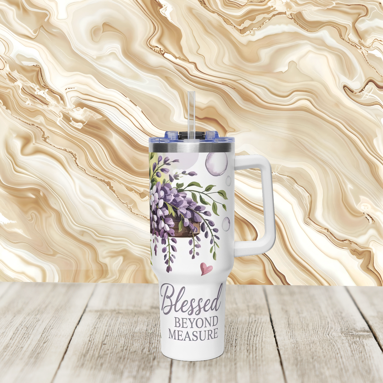 40oz Floral Cross Vacuum Tumbler — "Blessed Beyond Measure"