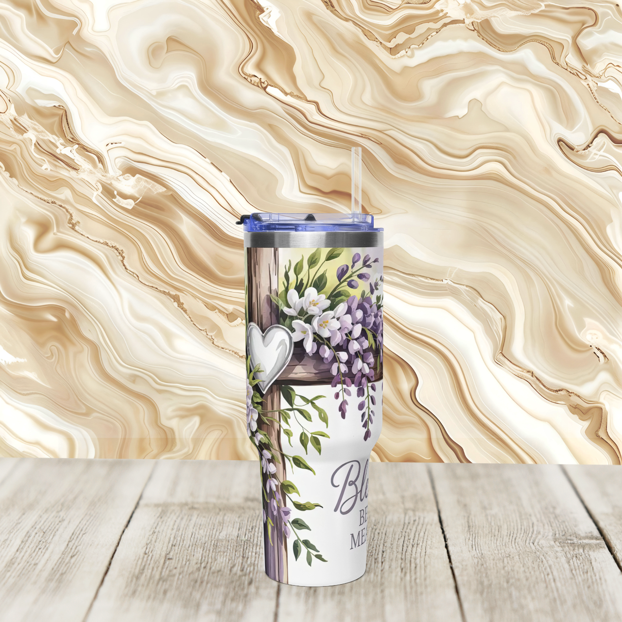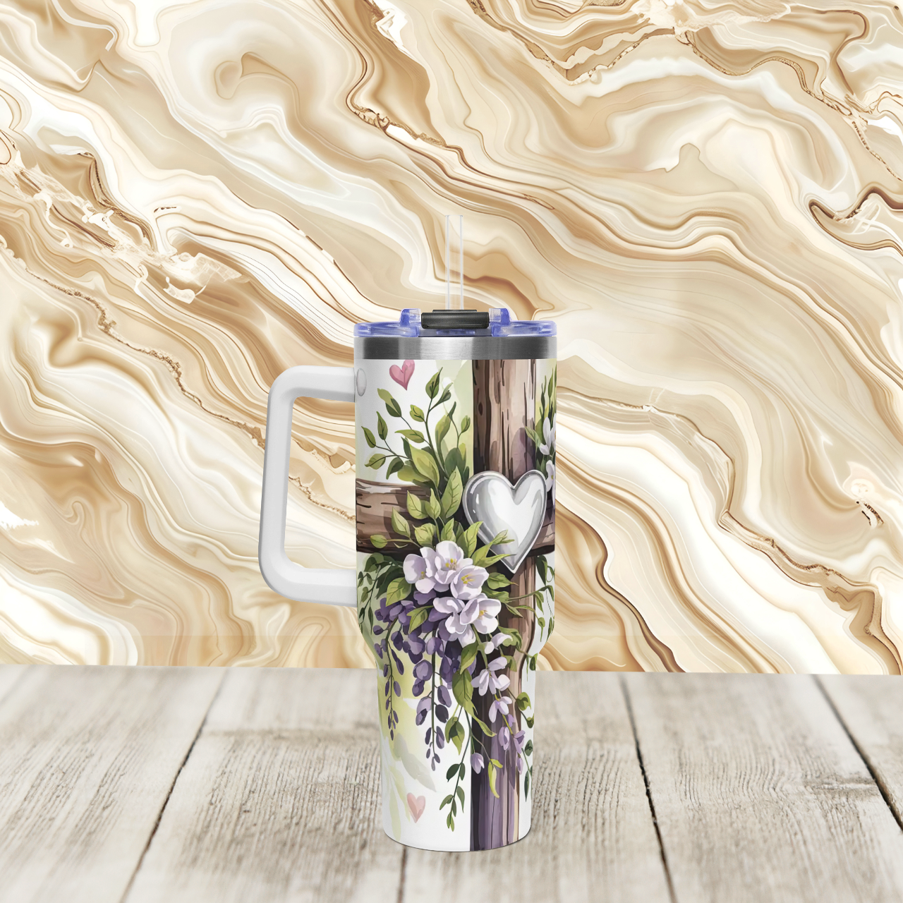 This 40oz vacuum thermal tumbler carries a quiet, cottagecore spirit — hand-painted lilacs and white blossoms curl around a rustic wooden cross, with carved-heart details that feel like a handwritten blessing. Tall and slim with a comfortable handle, it moves with you through slow mornings and garden afternoons, keeping coffee steaming during early chores and iced tea chilled on long drives. The weight and warmth of it settle like a steady companion: familiar in your hands, resilient on the road, and gentle in moments when you want your drink to stay just right.